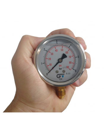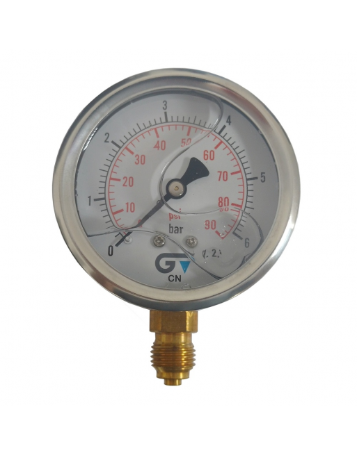 MANÓMETRO VERTICAL 90 PSI Ø 63 MM 0 - 6 BAR 1/4" BSP COM GLICERINA