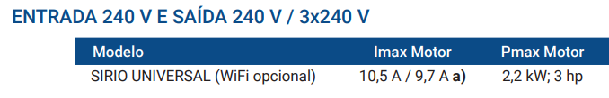 a) A saída da alimentação do motor pode ser programada p/ motores monofásicos 240 V com consumo máximo 10,5 A, ou p/ motores trifásicos, ligados em triângulo 3x240 V com consumo máximo 9,7 A.