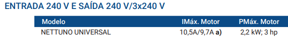 a) A saída da alimentação do motor pode ser programada p/ motores monofásicos 240 V com consumo máximo 10,5A, ou p/ motores trifásicos, ligados em triangulo 3x240 V com consumo máximo 9,7A.