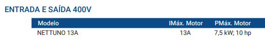 - No modelo universal: Alimentação 240 V e saída programável para 240 V (monofásico) ou 3x240 V (trifásico).