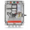 Caixa plástica 250x200x140 mm em ABS cinza RAL7035 com dobradiça e com tampa transparente em policarbonato. Contactor e relé térmico DANFOSS. Relé de nível para controlo de nível no poço e no depósito. Funcionamento automático, manual ou desligado, comandado por comutador de 3 posições com cápsula protetora. Proteção contra curto-circuitos através de disjuntor. Proteção contra sobrecargas através de relé térmico. Indicação de existência de água no depósito (LED verde no relé de nível). Indicação de falta de água no depósito (LED vermelho no relé de nível). Indicação de existência de água no poço (LED verde no relé de nível). Indicação de falta de água no poço (LED vermelho no relé de nível). Indicação de quadro em funcionamento automático (sinalizador amarelo). Indicação de motor ligado (sinalizador verde). Indicação de disparo térmico (sinalizador vermelho). 4 Bucins, para passagem dos cabos de ligação.