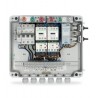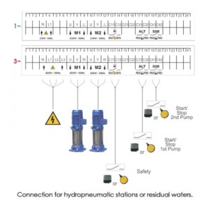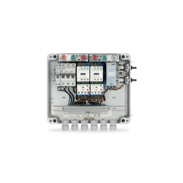 Caixa plástica 300x250x140 mm em ABS cinza RAL7035 com dobradiça e com tampa transparente em policarbonato, contactores e relés térmicos Danfoss. Relé de alternância para comando de alternância e simultaneidade. Funcionamento automático (AUT), manual (I) ou desligado (0), comandado em cada uma das bombas de forma independente por comutador de 3 posições com cápsula protetora. Ligação com tensão reduzida (12V) para comando remoto do arranque/paragem dos motores (pressostato, boia ou outro). Ligação com tensão reduzida (12V) para comando remoto de segurança (C11-C12) (pressostato, boia ou outro).