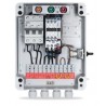 Caixa plástica 250x200x140 mm em ABS cinza RAL7035 com dobradiça e com tampa transparente em policarbonato, contactor e relé térmico das marcas selecionadas. Funcionamento automático, manual ou desligado, comandado por comutador de 3 posições com cápsula protetora. Ligação para comando remoto de segurança (C11-C12) (boia, pressostato ou outros). Ligação para comando remoto de arranque/paragem (P11-P12) (pressostato, boia ou outros).