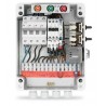 Caixa plástica 250x200x140 mm em ABS cinza RAL7035 com dobradiça e com tampa transparente em policarbonato, contactor e relé térmico da marca DANFOSS Funcionamento automático, manual ou desligado, comandado por comutador de 3 posições com cápsula protetora. Funcionamento do alarme sonoro em automático (AUT), teste ou desligado (0), por comutador 3 posições com cápsula protetora, sem interferir no alarme luminoso. Ligação para comando remoto de arranque (C21-C22) e paragem (C11-C12) (pressostato, boia ou outros). Ligação para comando remoto de alarme (C31-C32) (boia, pressostato ou outros).