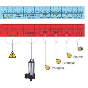 Caso se pretenda utilizar apenas um comando para o arranque e paragem, deverá ser feito um “shunt” no comando (C21-C22), ficando (C11-C12) a funcionar como comando de arranque e paragem. Sempre que o comando de alarme (C31-C32) fechar, serão ligados o sinalizador de alarme e o alarme sonoro, podendo este ser desligado através do respetivo comutador. Com o comutador do circuito de comando na posição manual, a bomba liga, independentemente do estado dos comandos de arranque e de paragem. O disparo do relé térmico devido a sobrecarga (sinalizador vermelho) faz desligar a bomba, independentemente do estado de qualquer dos comandos.