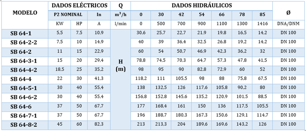 · De 30 a 85 m3/h com Hm até 226 mca.