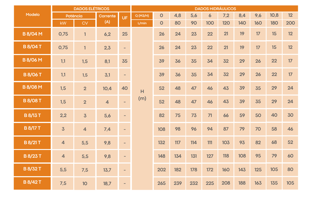 A HIDRAL B8 é uma bomba submersível centrífuga multicelular, projetada para funcionar em furos e poços artesianos de 4” ou maiores, com um caudal robusto de 12.000 litros por hora. É a solução ideal para aplicações de elevado débito, tanto em ambientes residenciais como industriais e agrícolas.