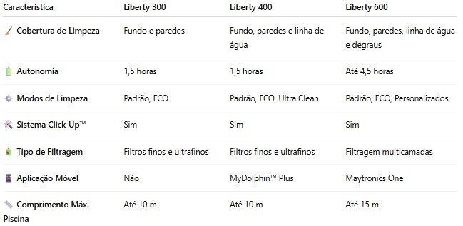 A gama Dolphin Liberty oferece aspiradores robóticos sem fios que combinam design inovador, tecnologia avançada e facilidade de uso. Cada modelo foi desenvolvido para proporcionar uma limpeza eficaz e sem complicações, adaptando-se a diferentes tamanhos e tipos de piscinas.