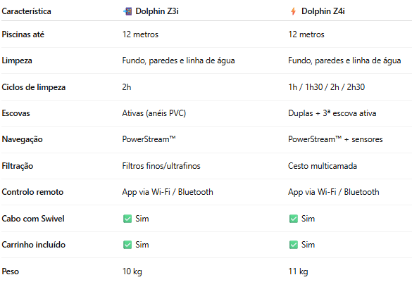 Os modelos Dolphin Z3i e Z4i foram concebidos para quem procura autonomia, desempenho e controlo remoto total. Com tecnologia inteligente, controlo via app MyDolphin™ Plus, escovas ativas e filtragem avançada, estes robôs elétricos proporcionam uma limpeza excecional — ideal para utilizadores exigentes.
