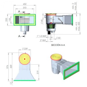 • Ligação inferior de aspiração: rosca interior 1½", exterior 2"
