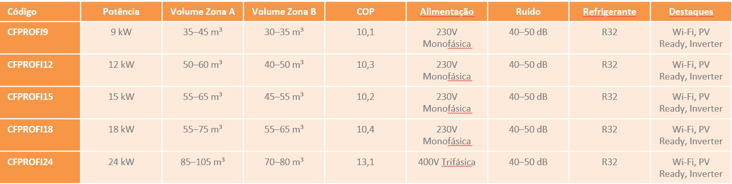 - Baixo consumo energético e elevada eficiência (COP elevado)