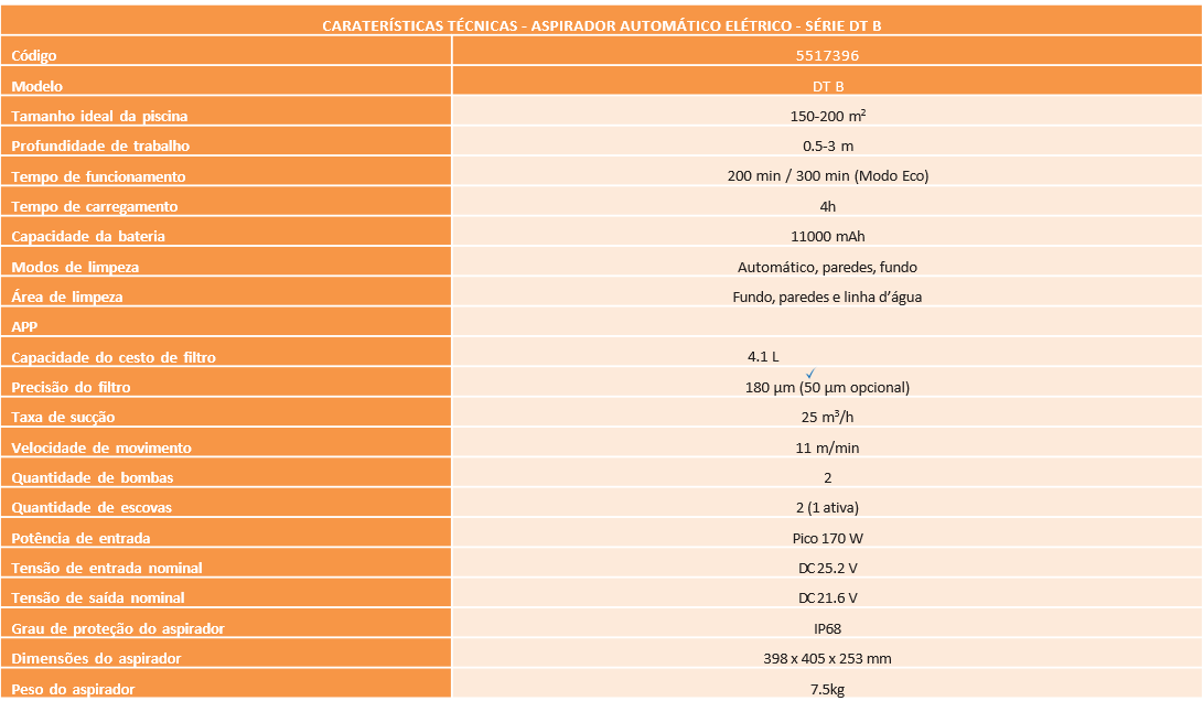 O Aspirador Automático Elétrico Série DT B foi desenvolvido para proporcionar uma limpeza completa, inteligente e sem fios da piscina, combinando elevada autonomia, forte capacidade de sucção e tecnologia avançada de navegação.
