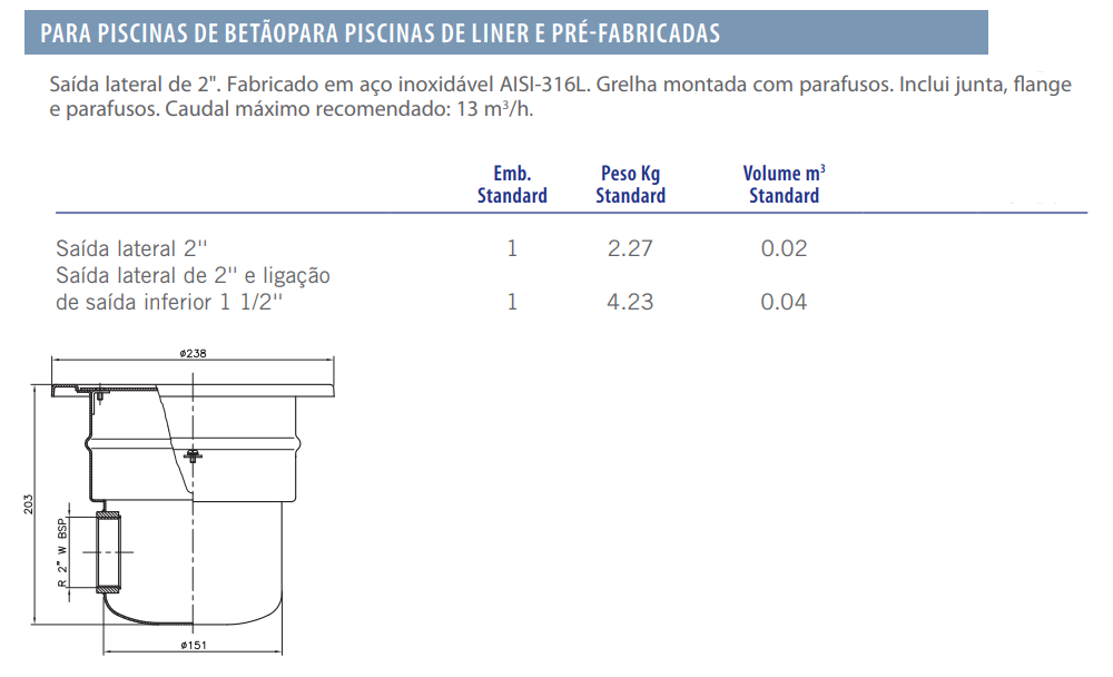 Inclui: Juntas, flange e parafusos de fixação para montagem em piscina de liner.
