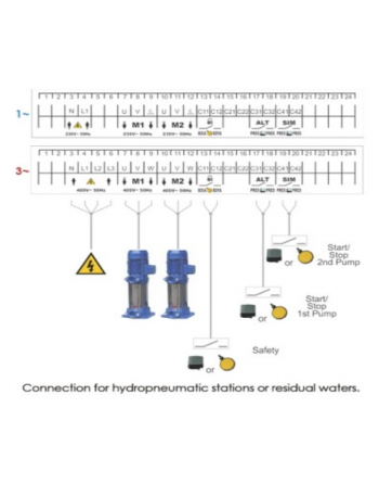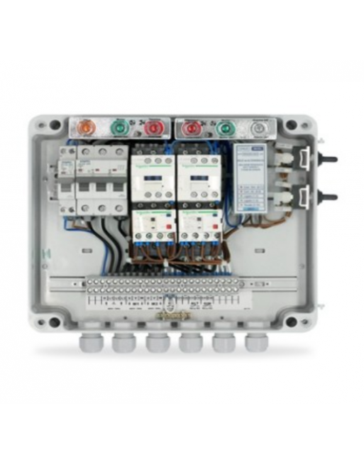 Caixa plástica 300x250x140 mm em ABS cinza RAL7035 com dobradiça e com tampa transparente em policarbonato, contactores e relés térmicos Danfoss. Relé de alternância para comando de alternância e simultaneidade. Funcionamento automático (AUT), manual (I) ou desligado (0), comandado em cada uma das bombas de forma independente por comutador de 3 posições com cápsula protetora. Ligação com tensão reduzida (12V) para comando remoto do arranque/paragem dos motores (pressostato, boia ou outro). Ligação com tensão reduzida (12V) para comando remoto de segurança (C11-C12) (pressostato, boia ou outro).