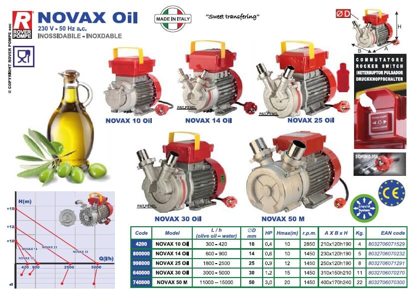 A Bomba Rover Novax Oil é uma bomba em inox de anel líquido, equipada com impulsor de geometria estrela e duplo sentido de rotação como padrão. O seu motor de alto rendimento é projetado para serviço contínuo, tornando-a ideal para a trasfega de azeites e óleos.